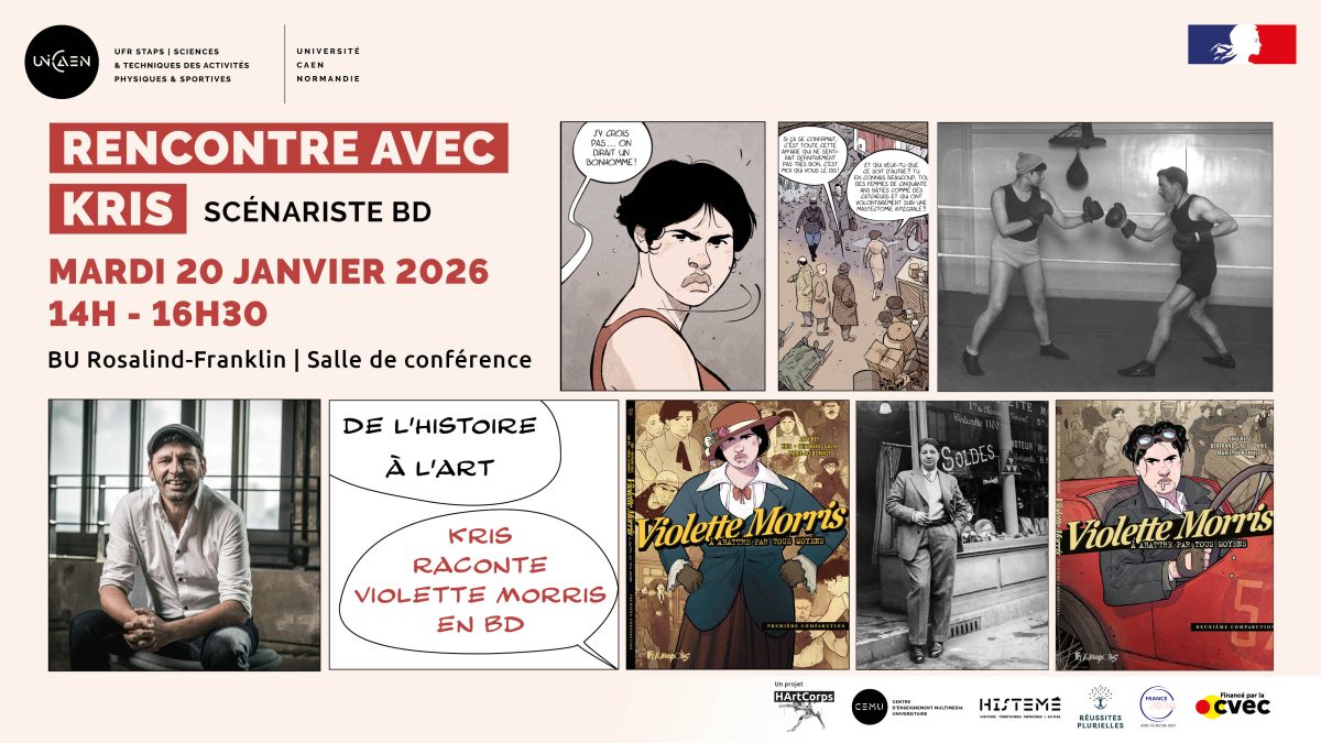 Le festival [En]Quête de Sciences s’associe au projet HArtCorps* mené par l’UFR STAPS pour une rencontre avec Kris autour de ses deux bandes dessinées historiques Violette Morris, à abattre par tous moyens. Rendez-vous mardi 20 janvier à 14h à la salle de conférence de la BU Rosalind-Franklin (campus 2).